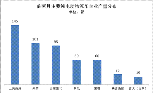 分車企看,前兩月純電動物流車有產(chǎn)量的企業(yè)達20家,其中產(chǎn)量僅1輛的車企就達9家,而對應(yīng)產(chǎn)量超過10輛的車企僅7家。超過百輛的車企僅2家:上汽商用車和眾泰;兩家產(chǎn)量總計達246輛,占據(jù)前兩月純電動物流車總產(chǎn)量的46%。