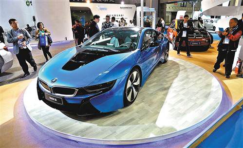 圖為參展的寶馬i8新能源汽車,車門比傳統車門重量輕50%。