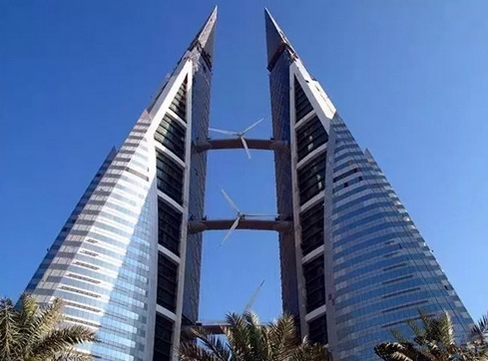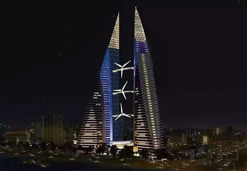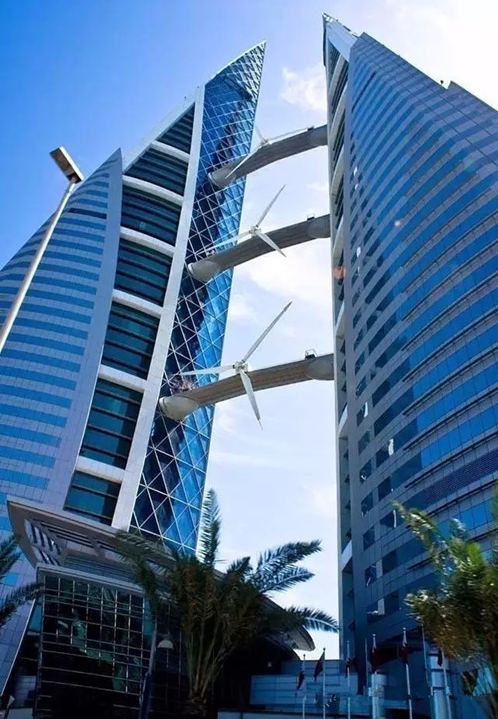 巴林世貿(mào)中心是世界上首座將風(fēng)電機(jī)組與大樓融為一體的摩天大樓。