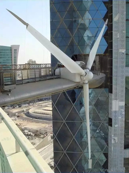 巴林世貿(mào)中心主體包括兩座50層的雙子塔,底部是一個三層的基座,其兩座三角形的大廈高度達(dá)240米。在兩座大廈之間設(shè)置了水平支持的3座直徑29米的風(fēng)力渦輪。風(fēng)帆一樣的樓體形成兩座樓之間的海風(fēng)對流,加快了風(fēng)速。風(fēng)電機(jī)組預(yù)計能夠支持大廈所需用電的11%-15%。