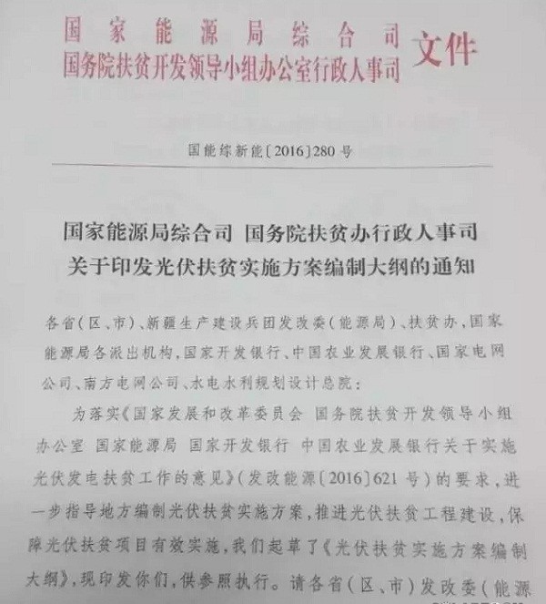 繼國家能源局4月底組織部分省區(qū)、電網(wǎng)公司、銀行和企業(yè)召開光伏扶貧推進(jìn)會后,光伏扶貧試點實施方案編制大綱正式由國家能源局和國務(wù)院扶貧辦聯(lián)合印發(fā)。本批次項目申報材料的提交時間為5月15日。