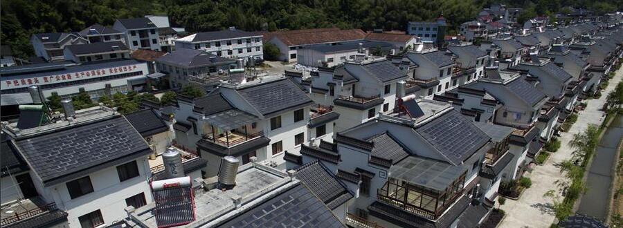 浙江建德:光伏瓦節(jié)能助脫貧浙江省建德市蓮花鎮(zhèn)戴家下山移民新村農(nóng)居的屋頂安裝的光伏瓦片(5月17日攝)。浙江建德市蓮花鎮(zhèn)戴家村下山移民新村光伏瓦發(fā)電項(xiàng)目于2013年11月正式投入使用以來,使用光伏瓦的農(nóng)居數(shù)量已達(dá)67戶,共計(jì)實(shí)現(xiàn)用戶節(jié)電15.2萬千瓦時(shí)。該新能源項(xiàng)目不僅環(huán)保節(jié)能,農(nóng)戶富余的電量還可以賣給國家電網(wǎng),成為下山移民扶貧脫貧新舉措。