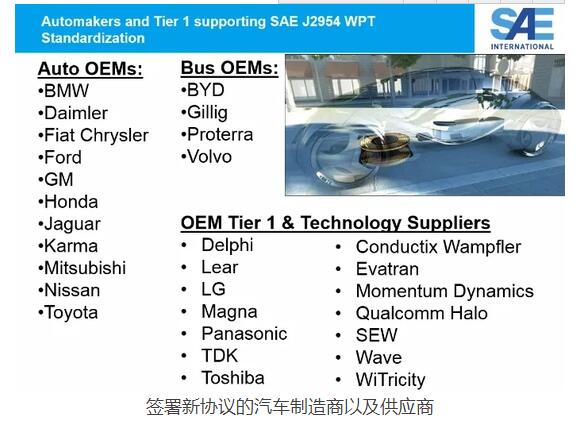 現行的SAEJ1772標準是插電式充電方面的規范,并由絕大多數汽車制造商采用。而接受新的TIRJ2954無線充電標準的汽車制造商包括戴姆勒(寶馬)、菲亞特-克萊斯勒、福特、通用、本田、捷豹路虎、三菱、日產以及豐田。這些已簽署協議的汽車制造商們的電動汽車目前占市面上絕大多數。據悉,一些位于行業供應鏈第一等級的原始設備制造商(OEM)們,比如德爾福、LG、松下、東京電氣化學TDK等也都簽署了新的無線充電協議。同時,生產應用于巴士的插電系統廠家,包括沃爾沃、比亞迪以及美國電動公交車公司普羅泰拉(Proterra)等,也共同簽署了該項協議。