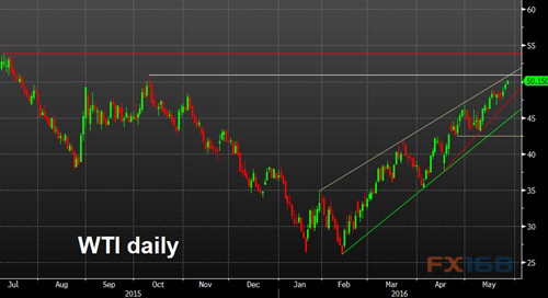周四(5月26日),突破50美元/桶對原油多頭來說無疑是里程碑事件,不過國外財經網站Forexlive分析師Adam Button指出,這一關口水平并非技術上的轉折點。連續三日漲勢推動油升至去年10月12日以來最高水平,不過10月9日高位50.92美元/桶才是需要關注的水平。