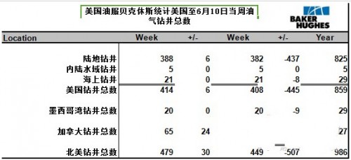 美國至6月10日當周石油鉆井增加了3臺,天然氣鉆井也增加了3臺,總鉆井總數增加了6臺。