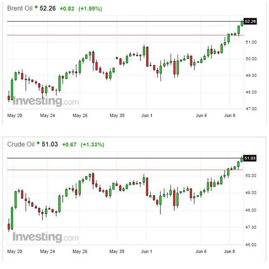 彭博還援引交易員稱,昨晚公布的美國截至6月3日庫欣原油庫存下降逾100萬桶,這和OPEC成員國尼日利亞局勢未見顯著改觀一道利好油市。