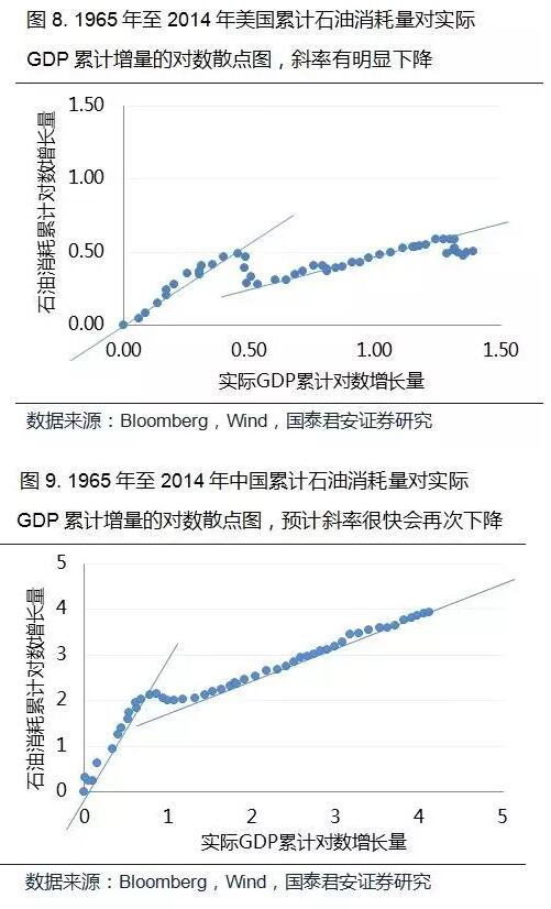 從石油的需求特性來看,其價格彈性較低而收入彈性較高,這就意味著前期油價腰斬式的下跌并不能刺激需求的顯著提升,而收入提高所帶來的需求增加也受到兩方面的制約:一是能源利用效率的提升和經濟增長模式的改變;二是全球貿易活躍度的下降和整體經濟增速放緩。圖8是1965年至2014年美國實際GDP增加值與石油消費增長量之間的散點圖,在圖中我們能夠清楚的看到,1980年前后,石油需求增長對GDP的彈性大幅下降,表現為斜率的明顯走平,而2008年之后,需求的GDP彈性呈現出進一步下降的態勢,這主要源于能源利用效率的提升和經濟增長模式的進步。同樣在圖9當中,中國的石油消耗量對GDP增長的彈性在1970年后發生較為明顯的下降,隨著中國經濟增長方式的逐步轉變,單位GDP增長量所帶來的石油消費量將進一步減少。