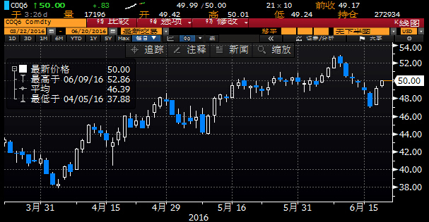周一(6月20日)亞歐時段國際油價震蕩上漲,美原油8月期貨一度刷新四日高點至49.44美元/桶,布倫特原油8月期貨一度上探50美元關(guān)口,美元走軟且市場對于英國可能退出歐盟的疑慮緩解,蓋過了美國原油鉆井?dāng)?shù)的增加的影響,幫助支撐油價。