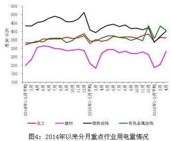 1-4月份,化學原料制品、非金屬礦物制品、黑色金屬冶煉、有色金屬冶煉四大高載能行業用電量合計5267億千瓦時,同比下降 4.4%,增速比上年同期回落2.7個百分點;合計用電量占全社會用電量的比重為29.1%,對全社會用電量增長的貢獻率為-47.8%。其中,化工行業用電量1405億千瓦時,同比增長4.0%,增速比上年同期提高1.1個百分點;建材行業用電量858億千瓦時,同比下降2.2%,增速比上年同期提高4.3個百分點;黑色金屬冶煉行業用電量1443億千瓦時,同比下降11.6%;增速比上年同期回落4.7個百分點;有色金屬冶煉行業1562億千瓦時,同比下降5.4%,增速比上年同期回落9.1個百分點。