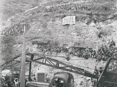 在四川威遠(yuǎn)縣曹家山建設(shè)指揮部,為不占良田、不拆民房,6000多名會戰(zhàn)人員吃住在窩棚,炸山取石,用10天時間,沿山坡修建起幾十棟用片石筑起的指揮機(jī)關(guān)、千人大禮堂、三層樓招待所,并修建一條300多級的石階通往山頂,定名為“紅村”。