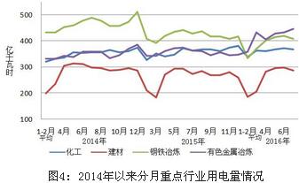 1-7月份,化學原料制品、非金屬礦物制品、黑色金屬冶煉和有色金屬冶煉四大高載能行業用電量合計9828億千瓦時,同比下降2.7%,增速比上年同期回落0.7個百分點;合計用電量占全社會用電量的比重為29.5%,對全社會用電量增長的貢獻率為-23.6%。其中,化工行業用電量2518億千瓦時,同比增長3.4%,增速比上年同期提高1.1個百分點;建材行業用電量1739億千瓦時,同比增長0.1%,增速比上年同期提高6.8個百分點;黑色金屬冶煉行業用電量2689億千瓦時,同比下降8.6%,增速比上年同期回落1.2個百分點;有色金屬冶煉行業2882億千瓦時,同比下降3.4%,增速比上年同期回落8.0個百分點。