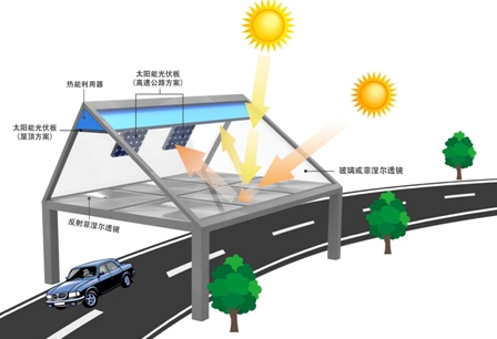 BolySolar屋頂系統利用反射式菲涅爾透鏡將分散的光源匯聚到中心區,其可以被安裝在屋頂的角落上. 菲涅爾透鏡的形態可以是線性的或者同心的。 其不同形式的選擇,可由產品聚光比率的需要和屋頂的形狀決定。