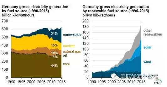 在過去10年以來,德國發電量中可再生能源發電量增加兩倍,2015年可再生能源發電占比已達到31%。
