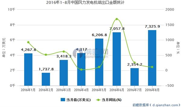 數據顯示,2016年1-8月中國風力發電機組出口金額為36685.6萬美元,同比增長208.2%。其中,8月出口金額現今年最高峰,達到7325.9萬美元。2016年1-8月中國風力發電機組出口金額統計表如下表所示: