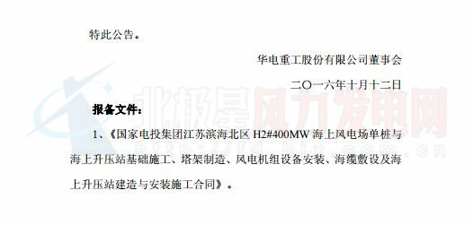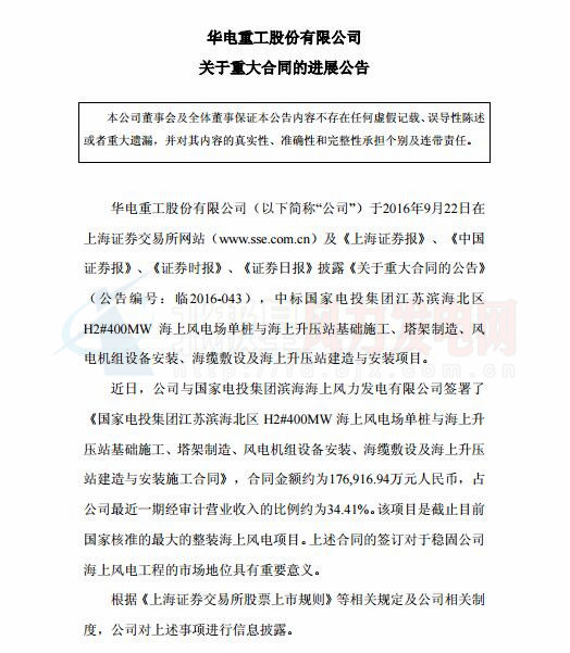 據悉,該項目是截止目前國家核準的最大的整裝海上風電項目。上述合同的簽訂對于穩(wěn)固華電重工海上風電工程的市場地位具有重要意義。以下為公告原文: