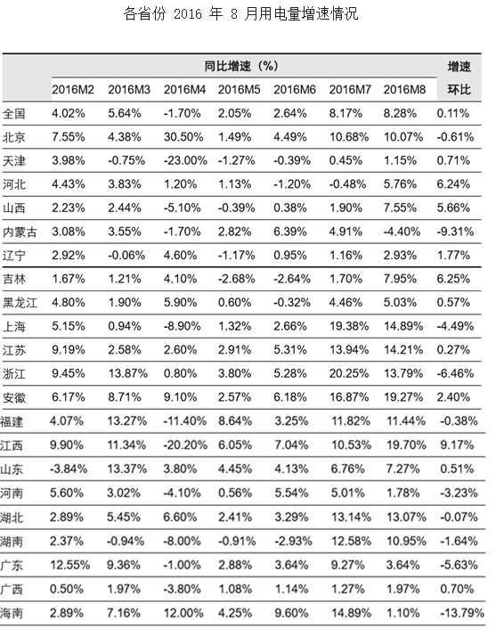 2016年8月全國14省用電量增速超 10%各省份8月用電量增速情況統計