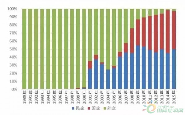 從風(fēng)電制造企業(yè)歷年新增裝機(jī)容量看,2000年之前,外企獨(dú)占整個(gè)中國風(fēng)電市場。2001年起中國風(fēng)電市場格局發(fā)生改變,中國企業(yè)勢(shì)力開始增強(qiáng),市場占有率達(dá)到35.4%(民企25.9%,國企9.5%),外企下降到64.6%。但2003年至2004年,中國企業(yè)出現(xiàn)萎縮,2004年占有率下降到不足25%,且?guī)缀跞縼碜悦衿螅馄笫袌稣加新蔬_(dá)到75%。2005年,隨著中國企業(yè)數(shù)量的增加,市場占有率也在逐年攀升,尤其國企增長明顯,從圖2可以看出,外企的市場份額逐漸被國企吞噬。2014年中國企業(yè)市場占有率達(dá)到歷史高點(diǎn)98.3%(民企45.3%,國企53%),外企1.7%。