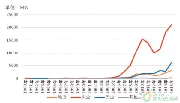 從歷年新增裝機(jī)的市場占有率看,從2005年到2015年,國企的市場占有率均超過80%,在2008年最高達(dá)到95%,之后又回落在80%至90%之間,其中,央企的市場占有率達(dá)到70%至80%之間,而地方國企僅占10%左右。從2009年至2015年,民企市場占有率整體趨勢(shì)顯示增強(qiáng),尤其在2013年和2014年,民企市場占有率達(dá)到20%左右。
