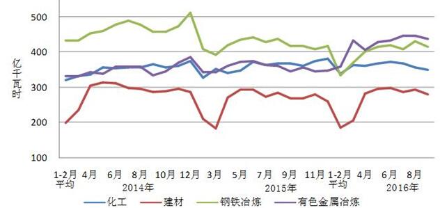 1-9月份,化學原料制品、非金屬礦物制品、黑色金屬冶煉和有色金屬冶煉四大高載能行業用電量合計12841億千瓦時,同比下降1.9%,增速比上年同期提高0.3個百分點;合計用電量占全社會用電量的比重為29.3%,對全社會用電量增長的貢獻率為-13.2%。其中,化工行業用電量3227億千瓦時,同比增長1.6%,增速比上年同期回落0.9個百分點;建材行業用電量2316億千瓦時,同比增長0.9%,增速比上年同期提高7.3個百分點;黑色金屬冶煉行業用電量3536億千瓦時,同比下降6.8%,增速比上年同期提高1.0個百分點;有色金屬冶煉行業3762億千瓦時,同比下降1.7%,增速比上年同期回落5.4個百分點。