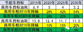 2030年的乘用車油耗要達(dá)到3.2升,較2015年的6.9升下降54%,而且每5年的環(huán)比下降幅度也是20%的驚人的高降幅,體現(xiàn)了乘用車的世界接軌決心。
