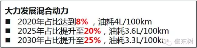 實(shí)現(xiàn)乘用車節(jié)能的第二個(gè)措施是大力發(fā)展混合動(dòng)力。此次設(shè)定的指標(biāo)是:2020年占比達(dá)到8%,油耗4L/100km;2025年占比提升至20%,油耗3.6L/100km;2030年占比提升至25%,油耗3.3L/100km。