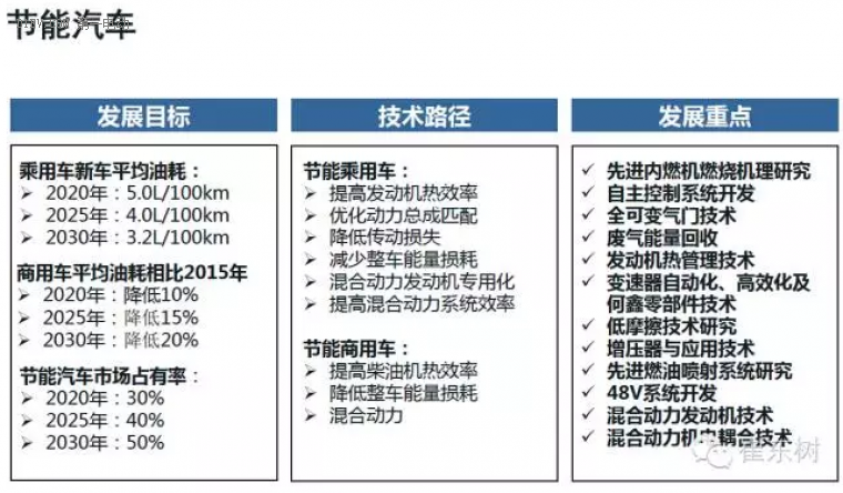乘用車:總體執(zhí)行車輛輕量化/小型化、大力發(fā)展混合動(dòng)力、動(dòng)力總成升級(jí)優(yōu)化、電子電器節(jié)能、降低摩擦損失、替代燃料分擔(dān)六大節(jié)能路徑。