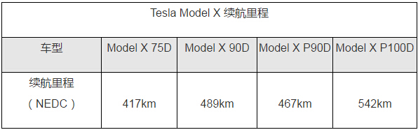 特斯拉Model X作為全球首款純電動SUV車型,其續航里程能夠從Model X 75D的417km到Model X P100D的542km,可以輕松比肩任何一款傳統SUV車型。