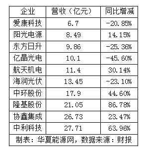 誰是營收冠軍?中利科技以27.71億元奪得頭籌,與去年同期相比漲幅較大。協鑫集成以26.73億緊隨其后,位列第二。而隆基股份雖然營收只有21.05億,但同比增長高達86.78%,遠超其他企業。