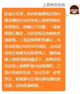 經請示總局,結合財政部和總局內部溝通的對光伏發電土地使用稅的處理意見,明確以下問題:一是按照現行規定,光伏發電沒有稅收優惠政策。二是應稅面積的確認,凡符合財稅[2006]56號規定,由光伏發電企業做為實際使用人、繳納城鎮土地使用稅的情況下,按照合同約定的土地面積做為應稅面積。三是對目前存在的“農光互補”經營形式,財政部與總局內部溝通的意見是,沒有優惠政策。