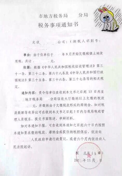 某光伏企業近日收到的城鎮土地使用稅催繳通知