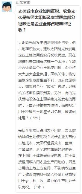 當農業光伏面臨變更占地土地的性質時,另一個問題也逐漸浮出水面——土地使用稅。日前,山東某市針對光伏電站的土地稅征收問題上,向上一級稅務系統征詢意見時,得到的回復如下: