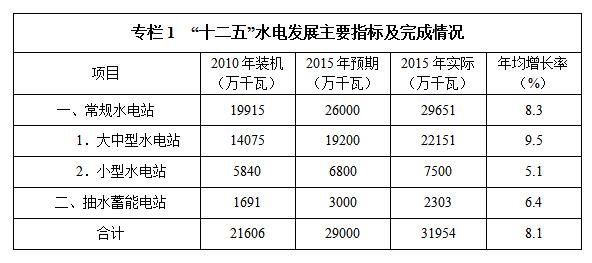 ——裝機規模不斷躍升。“十二五”期間,新增水電投產裝機容量10348萬千瓦,年均增長8.1%,其中大中型水電8076萬千瓦,小水電1660萬千瓦,抽水蓄能612萬千瓦。到2015年底,全國水電總裝機容量達到31954萬千瓦,其中大中型水電22151萬千瓦,小水電7500萬千瓦,抽水蓄能2303萬千瓦,水電裝機占全國發電總裝機容量的20.9%。2015年全國水電發電量約1.1萬億千瓦時,占全國發電量的19.4%,在非化石能源中的比重達73.7%。