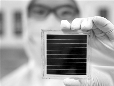 我國在鈣鈦礦電池研發(fā)領(lǐng)域取得重要突破。上海交通大學(xué)韓禮元教授團(tuán)隊(duì)和蘇州黎元新能源科技有限公司合作研發(fā),使面積36平方厘米鈣鈦礦太陽能組件的能量轉(zhuǎn)化效率突破了12%。圖為12月14日,技術(shù)人員在展示鈣鈦礦太陽能薄膜電池器件。新華社記者 陳飛攝