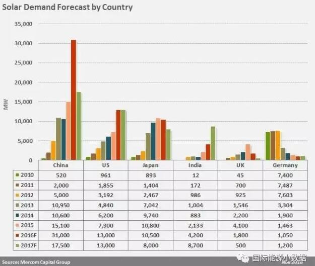 2015年全球光伏新增裝機為51GW,其中有15GW來自中國。根據Mercom Capital集團的預測,2016年全球光伏裝機增幅可達48%,新增裝機76GW,其中有超過31GW來自中國,其他來自美國(13GW)、日本(10.5GW)、印度(4.2GW)、英國(1.8GW)、德國(1.1GW)。
