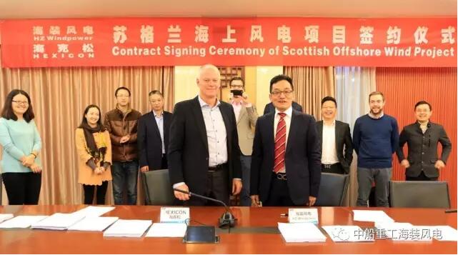 2016年12月22日,海裝風電與英國10MW海上浮動平臺風電項目業主HEXICON AB 在重慶簽署供貨合同。公司副總經理孟黎及業主方CEO 安德斯•巴恩分別代表雙方簽字,標志著海裝風電5MW海上風電機組裝備獲得國際市場認可、成功布局海外主流海上風電市場。