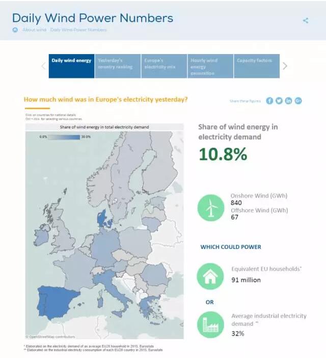 該平臺的第一個模塊顯示,風電每天為數以百萬計的歐洲家庭和企業提供電力。去年風電覆蓋了歐盟電力需求的10.4%。在一些日子里,在部分成員國則覆蓋了超過100%的電力需求。