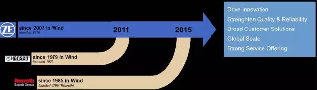 2007年,采埃孚(ZF)憑借其在車輛變速箱領域積累的豐富經驗開始向Vestas批量供貨風電齒輪箱;2011年,收購Hansen;2015年,收購Rexroth風電齒輪箱業務。