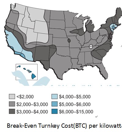 下面的地圖(圖三)顯示的就是美國每個州的BTC值。從地圖上可以看出,夏威夷有最高的BTC值,意味著這里電費最貴,最適宜采用光伏發電。加州和紐約也是比