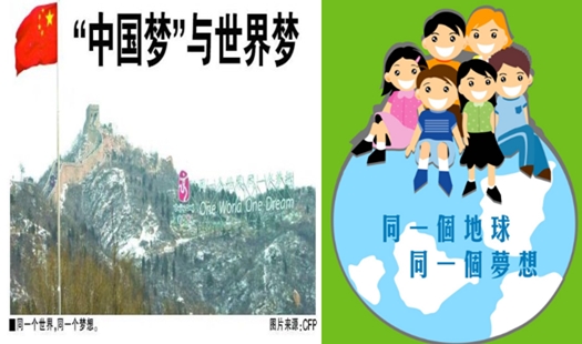 社科院專家學者在解釋個人夢與中國夢的關系時說,個人夢和國家夢,有內在聯系,這就是個人的奮斗理想離不開國家,離不開國家夢的實現。同時,國家夢的實現,特別是中華民族偉大復興的實現,又有賴于每一個人最大限度地把自己的聰明才智和創造力發揮出來。中國夢實現了,將會極大地造福世界各國人民。如下圖所示,同一個世界,同一個夢想。