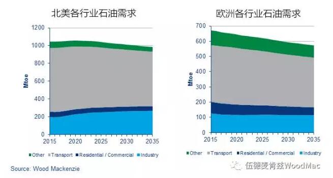 與世界上其它地區(qū)相比,北美和歐洲的石油需求更可能出現(xiàn)負(fù)增長。這一方面因為他們長期在碳減排方面做出的努力,另一方面也得益于北美和歐洲較為充足和低成本的天然氣供應(yīng)。我們預(yù)計到2035年,全球的能源需求將趨于平穩(wěn),北美的增長變得更加溫和,而歐洲的需求將逐步下降。本文基于我們的石化燃料系列報告,將進(jìn)一步分析未來20年能源需求的發(fā)展趨勢和可再生能源的崛起。