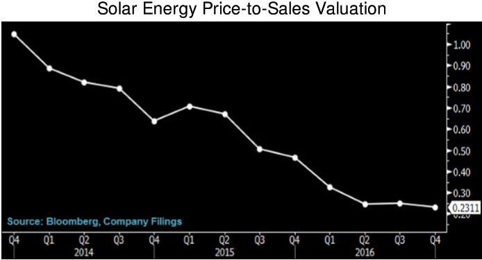 據彭博行業研究平臺數據顯示,自2015年第四季度以來,全球太陽能行業集團的股價與銷售額比率中位數從0.5X下降到0.2x,其中主要原因仍然是由于股價下跌52%。2016年6月底,來自中國的太陽能設備需求下降,這些太陽能集團收入也開始急劇下滑,這有助于緩解太陽能設備供過于求的現象。預期2017年全球太陽能需求放緩,產能增加,會加劇業內對太陽能設備價格以及生產者利潤空間走低的擔憂情緒。