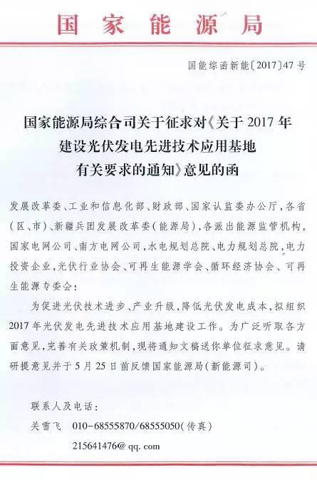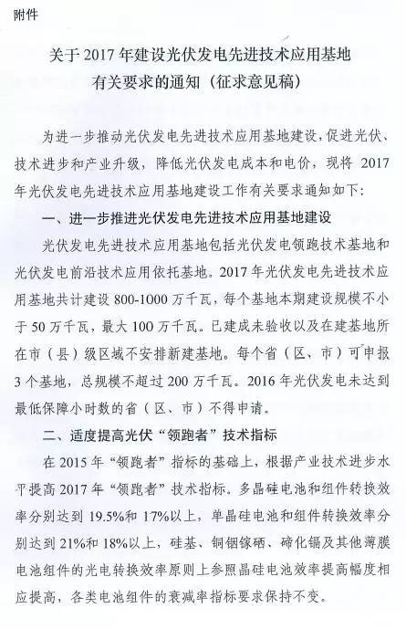 近日,華夏能源網(微信號sinoergy_com)獲悉,國家能源局綜合司發出了名為《關于2017年建設光伏發電先進技術應用基地有關要求的通知》的征求意見稿,對光伏發電先進技術應用基地建設的規劃、優選、評分規則等做意見征集。