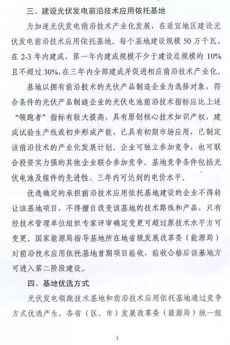 相比此前業界盛傳的“領跑者升級版”計劃,通知提出的“光伏發電前沿技術應用依托基地”明顯縮水,每個基地建設規模確定為500M瓦(此前傳說每個基地至少1GW),基地在2-3年內建成,第一年內建成規模不少于建設總規模的10%且不超過30%,在三年內全部建成并促進相應前沿技術產業化。