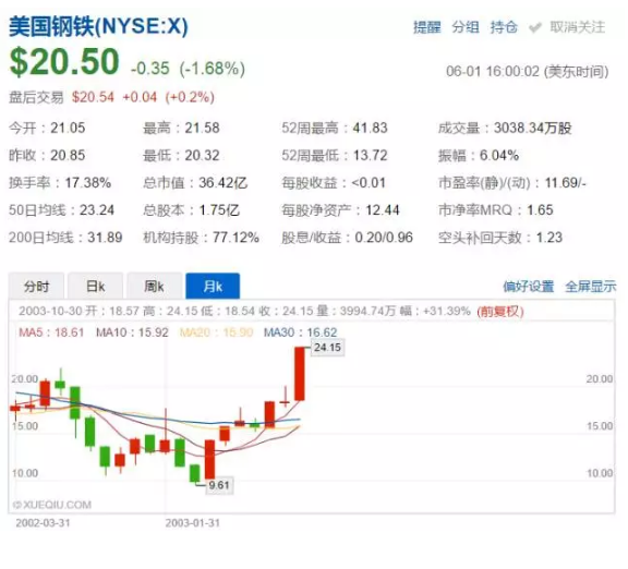 下圖是美國鋼鐵在“201條款”執行期間(2002年3月–2003年12月)的股價波動,經歷了先跌后漲。