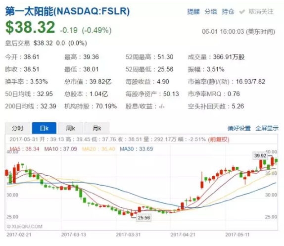 截止至2017年6月1日,第一太陽能(代碼:FSLR)的收盤價為38.32美元,在短短兩個月的時間內,FSLR股價已經從最低點的25.56美元反彈了50%。