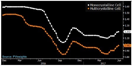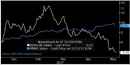 繼2016年大跌52%之后,2017年年初以來,BI 旗下行業研究的太陽能標桿企業相關股指下跌5%。市場情緒可能已經因為中美兩國貿易關系緊張(歐盟將對中國制造太陽能電池板的反傾銷關稅延長了18個月)、國際油價下跌、SolarWorld申請破產(2017年年內股價重挫49%)而進一步惡化。First Solar和SunPower(2017年股價分別漲9%和7%)這類美國太陽能企業削減成本的努力可能緩和市場對降價壓力和行業產能過剩的擔憂。