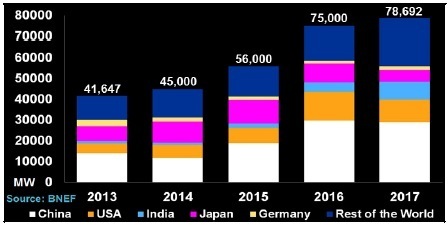 雖然中國、日本和美國這三大重要市場的太陽能裝機新增需求增長停滯,但2017年全球裝機總需求料將繼續增加。BNEF預測,2017年印度、拉美和東南亞可能給全球需求帶來新的動力,總需求將由此增至7.86萬兆瓦,超過2016年7.5萬兆瓦的估算需求量。2017年中國計劃進一步削減新能源補貼,以求降低這類補貼造成的財政赤字。因此,在2016年達到創紀錄新高以后,太陽能需求的增速可能受到抑制。