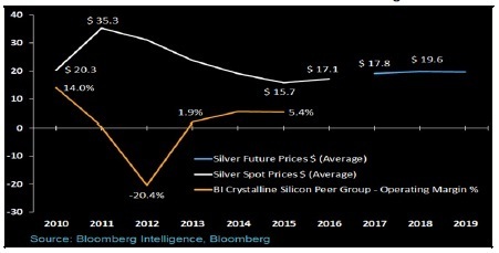 2016年現貨銀價均價為每盎司17.13美元,較2015年均價上漲9%,因此太陽能電池制造商2016年的盈利可能縮水。共識預期顯示,到2018年,銀價可能再攀升16%。這可能導致太陽能電池制造商的投入成本增加,但到2018年現貨銀價料將始終低于2012年到2014年的平均水平:每盎司24.90美元。太陽能制造商的盈利已經與銀價呈現負相關。太陽能組件價格和多晶硅成本對制造商盈利也很重要。