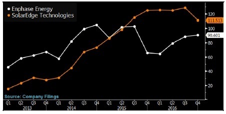 2017年1季度,太陽能逆變器供應商Enphase推出最新款微型太陽能逆變器,集太陽能發電、儲能和家用能源管理系統于一身。其競爭對手SolarEdge正在向歐洲市場推廣類似產品。家用能源管理系統給逆變器供應商帶來了售后服務的商機,比如提高能源效率的服務、監控以及保養設備。逆變器供應商還可能開發新的銷售商機,以滿足市場需求和電網的服務,比如儲能集群產品。