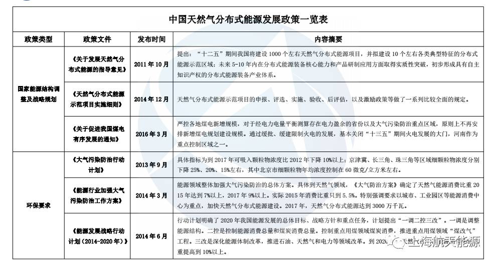 這些文件中,有國(guó)家能源結(jié)構(gòu)等整體規(guī)劃,有天然氣分布式行業(yè)的指導(dǎo)性意見和分布式有關(guān)的電力、天然氣基建等外圍行業(yè)改革方向,以及地方上落實(shí)國(guó)家政策的扶持辦法。